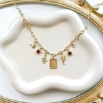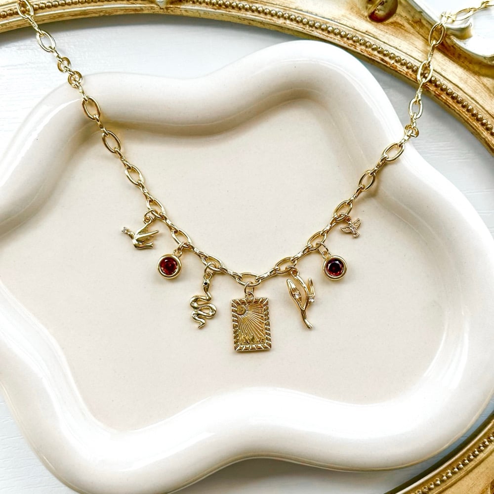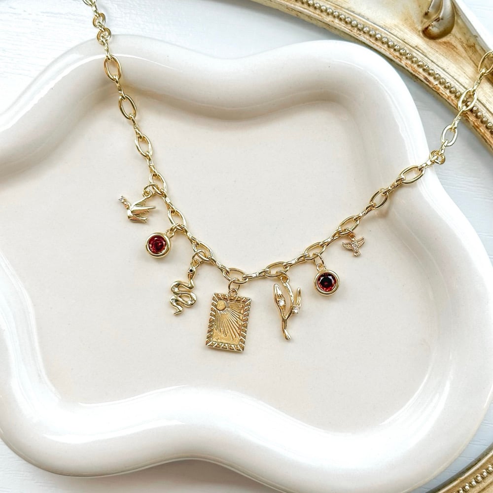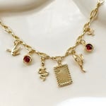An 18” gold plated oval paperclip chain with a 2” chain extender, decorated with 7 gold plated charms.