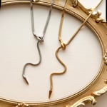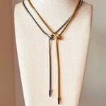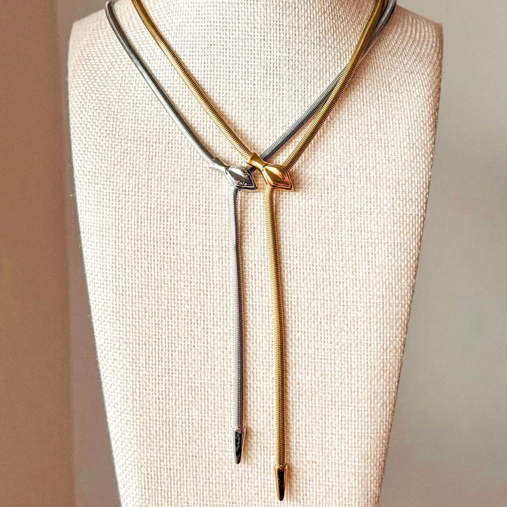 A fully adjustable stainless steel snake chain with a snake head focal pendant . The chain with a medium sized tail measures about 19” and the small tail (last photos) measure about 27”.